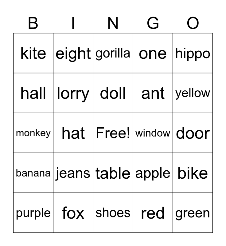This bingo card has a free space and 68 words: book, green, cat, four, jam, arm, eight, ice cream, doll, alphabet, table, girl, door, hippo, horse, hall, hat, kite, jacket, jeans, ant, apple, banana, igloo, flower, frog, bat, hand, bike, computer, gorilla, seven, six, five, one, blue, pink, purple, yellow, monkey, cake, lemon, lorry, zebra, zero, box, yoyo, swim, window, fox, umbrella, van, trousers, shoes, skirt, star, red, ride, quick, queen, pink, pizza, crocodile, orange, nose, monkey, money and milk.