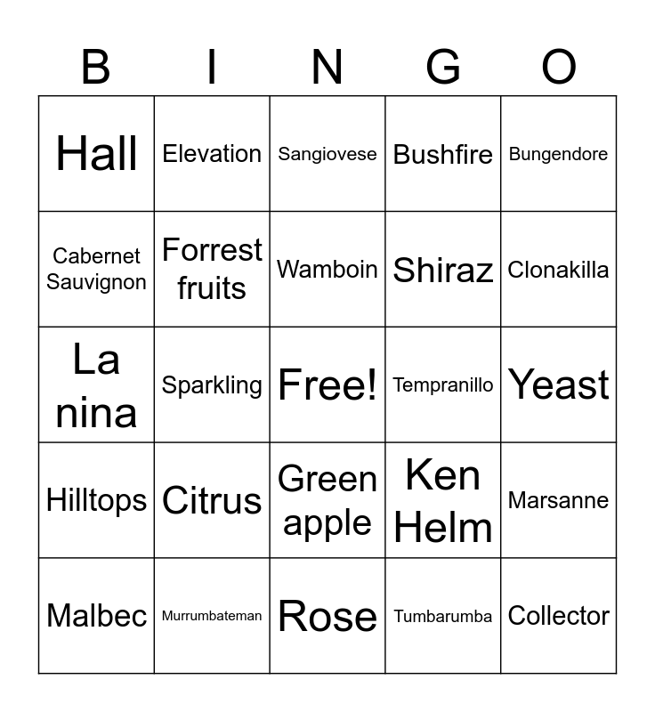 This bingo card has a free space and 59 words: Reisling, Murrumbateman, Cool climate, Hilltops, Tumbarumba, French oak, Forrest fruits, Berries, Shiraz, Frost, Bushfire, Chardonnay, Cabernet Sauvignon, Lake George, Canberra, Hall, Collector, Bungendore, Yass, Wamboin, Tempranillo, Sangiovese, Malbec, Marsanne, Rousanne, Graciano, Grüner Vetliner, Helm, Clonakilla, Altitude, Soil, Clay, Pinot Noir, Cellar door, Elevation, Vintner's Daughter, Four Winds, Sparkling, Pizza oven, La nina, El nino, Citrus, Yeast, Lees, Tannin, Acidity, Palate, Ferment, Green apple, Rose, Residual sugar, Spicy, Syrah, CSIRO scientists, John Kirk, Ken Helm, Viognier, Cherry and Vanilla.