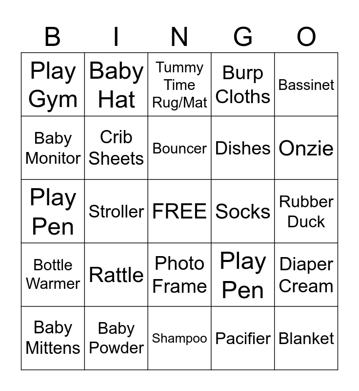 This bingo card has a free space and 49 words: Bibs, Blanket, Bottles, Shampoo, Rattle, Teether, Baby Hat, Car Seat, Baby Monitor, Changing Pad, Crib Sheets, Burp Cloths, Diaper Cream, Play Pen, Diaper Bag, Highchair, Bouncer, Socks, Bath Tub, Bassinet, Stroller, Pacifier, Play Gym, Dishes, Shoes, Onzie, Baby Mittens, Swaddles, Photo Frame, Bottle Warmer, Trash Can, Toy Basket/box, Night Light, Thermometer, Baby Powder, Wash Cloths, Sound Machine, Stuffed Animal, Rubber Duck, Bows, Blocks, Swing, Baby Gate, Milk Storage Bags, Play Pen, Tummy Time Rug/Mat, Boogie Sucker, Car Mirror and Towels.