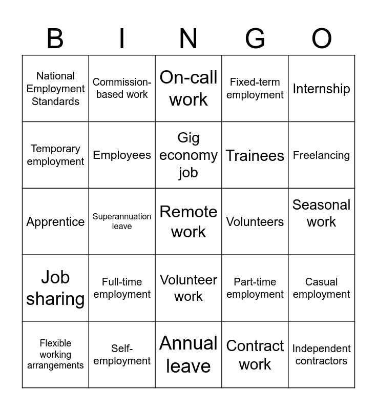 This bingo card has 25 words: Full-time employment, Annual leave, Gig economy job, Flexible working arrangements, Internship, National Employment Standards, Temporary employment, Commission-based work, Volunteers, Volunteer work, Trainees, Apprentice, Part-time employment, Casual employment, Employees, Independent contractors, Seasonal work, On-call work, Freelancing, Superannuation leave, Remote work, Self-employment, Job sharing, Fixed-term employment and Contract work.