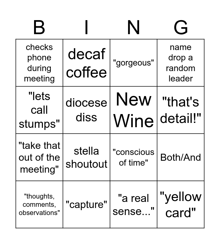This bingo card has 16 words: "capture", Both/And, "gorgeous", checks phone during meeting, "take that out of the meeting", decaf coffee, "conscious of time", "a real sense...", "lets call stumps", diocese diss, "thoughts, comments, observations", name drop a random leader, stella shoutout, "that's detail!", New Wine and "yellow card".