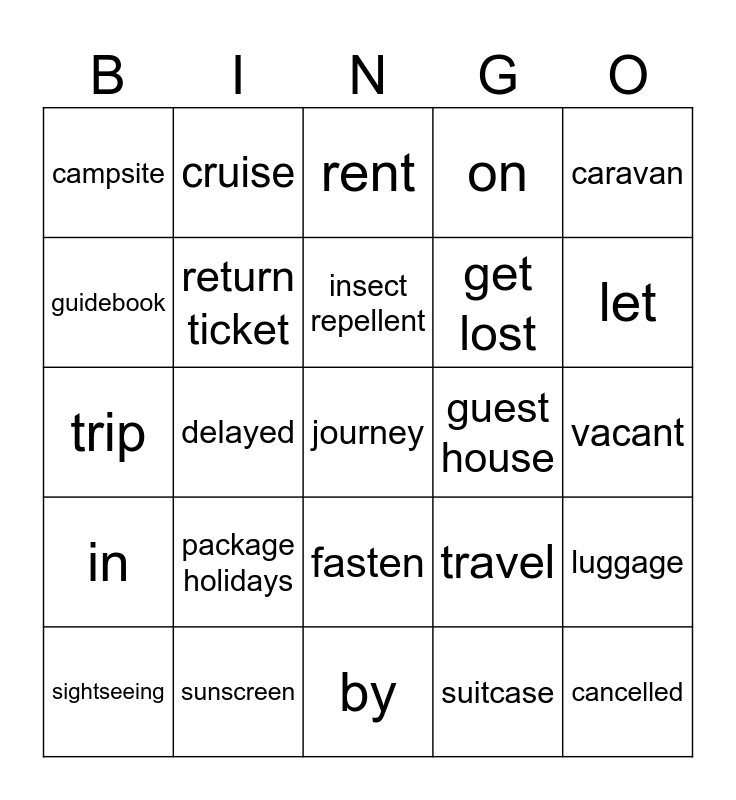 This bingo card has a free space and 24 words: package holidays, sunscreen, insect repellent, sightseeing, caravan, campsite, guidebook, cruise, guest house, fasten, get lost, trip, travel, luggage, return ticket, suitcase, vacant, rent, let, delayed, cancelled, in, on and by.