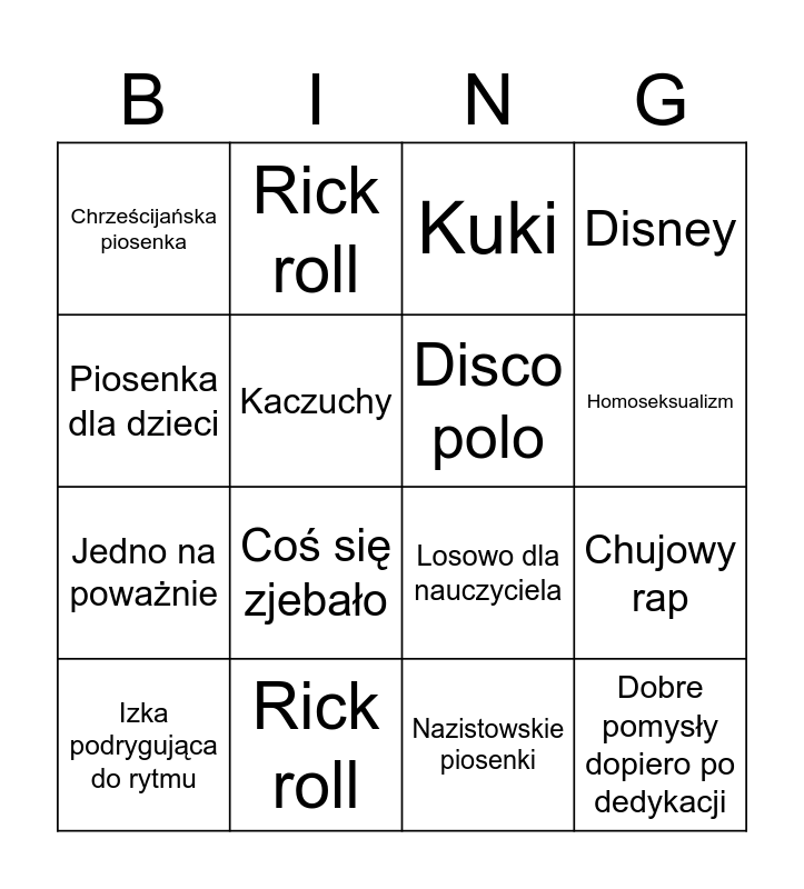 This bingo card has 18 words: Coś się zjebało, Dobre pomysły dopiero po dedykacji, Kuki, Chrześcijańska piosenka, Losowo dla nauczyciela, Disney, Izka podrygująca do rytmu, Rick roll, Homoseksualizm, Jedno na poważnie, Nazistowskie piosenki, Piosenka dla dzieci, Chujowy rap, Kaczuchy, Disco polo, Nauczyciel narzekający że traci lekcje, Rick roll and Kaczuchy.
