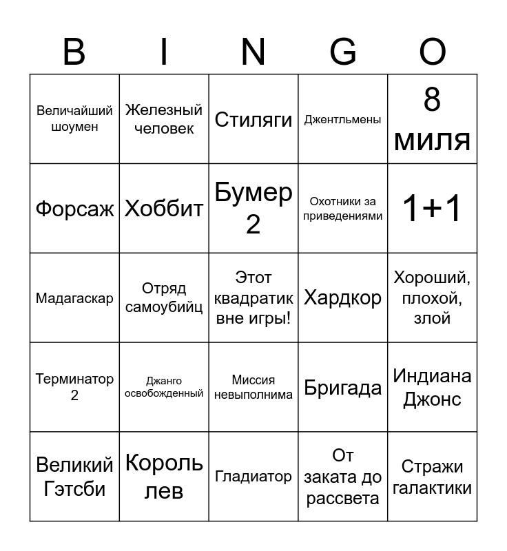This bingo card has a free space and 25 words: Джанго освобожденный, Гладиатор, Бумер 2, Великий Гэтсби, 8 миля, Величайший шоумен, Форсаж, Железный человек, Хардкор, Миссия невыполнима, Охотники за приведениями, Мадагаскар, Бригада, Индиана Джонс, Хоббит, Твин Пикс, Хороший, плохой, злой, Стиляги, 1+1, Отряд самоубийц, Стражи галактики, Король лев, Терминатор 2, Джентльмены and От заката до рассвета.