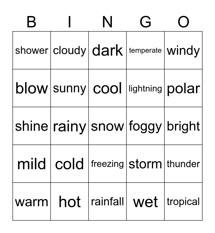 This bingo card has a free space and 24 words: cold, hot, cool, warm, windy, shower, blow, cloudy, foggy, freezing, lightning, shine, storm, thunder, sunny, wet, bright, dark, polar, rainy, tropical, mild, temperate and rainfall.