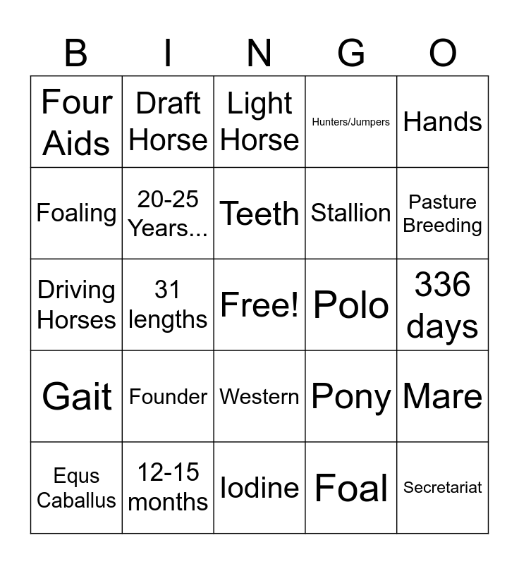 This bingo card has a free space and 28 words: Mare, Gelding, Stallion, Foal, Foaling, Light Horse, Draft Horse, Gait, Polo, Equs Caballus, Driving Horses, Hunters/Jumpers, 12-15 months, Iodine, Pasture Breeding, Colic, Founder, 20-25 Years..., Teeth, Western, Four Aids, A series of Three Races, Secretariat, 31 lengths, 336 days, Pony, Hands and Conformation.
