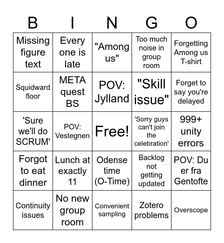 This bingo card has 1 images, a free space and 44 words: "Crewmate", Overscope, "Testees", Continuity issues, "Gamer", Zotero problems, "Among us", Technical issues at tests, Forgetting Among us T-shirt, No new group room, Too much noise in group room, 'Sorry guys can't join the celebration', Odense time (O-Time), Lunch at exactly 11, Kantine miss, Convenient sampling, "Oops forgot TA", 'Sure we'll do SCRUM', 2 people show op, Forget to say you're delayed, Every one is late, Requirements not clear enough, Goofy ahh powerpoint slides, Missing figure text, 999+ unity errors, Github incidents, 'oh its 13? Time to go home', Backlog not getting updated, Forgot to eat dinner, POV: Tingbjerg, POV: Du er fra Gentofte, POV: Brede, POV: Brønshøj, POV: AI no work, POV: Vestegnen, Shrimp check, Table Goblin, Overleaf incident, POV: Jylland, Squidward floor, "Skill issue", 2B schizophrenia, META quest BS and Rushed AV production.
