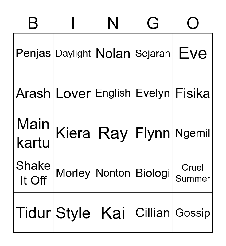This bingo card has a free space and 24 words: Morley, Style, English, Tidur, Eve, Penjas, Arash, Daylight, Flynn, Nonton, Evelyn, Main kartu, Biologi, Cruel Summer, Lover, Cillian, Ngemil, Nolan, Fisika, Kiera, Gossip, Shake It Off, Sejarah and Kai.