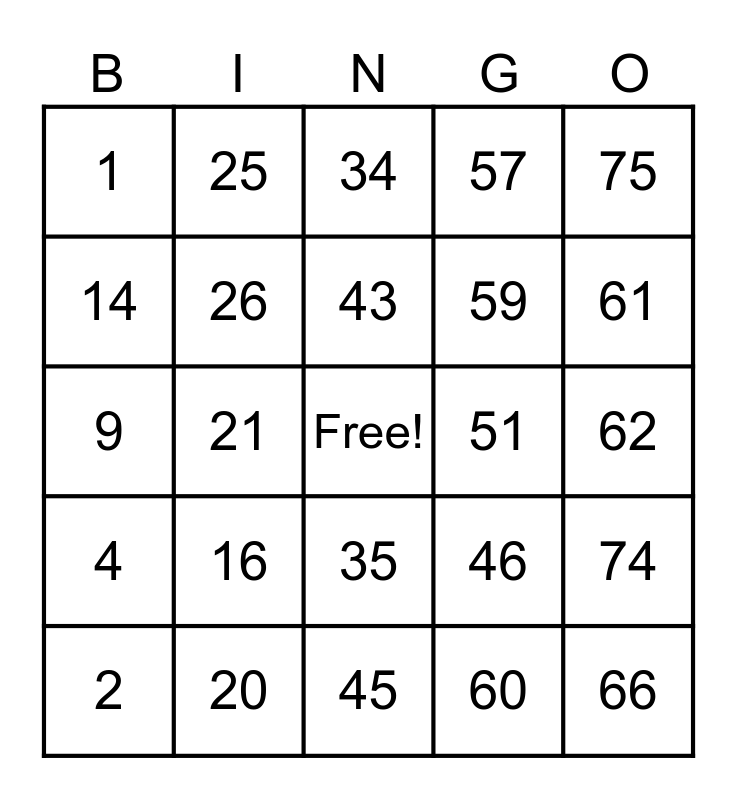 This bingo card has a free space and 24 words: 2, 16, 43, 60, 75, 1, 25, 34, 51, 62, 9, 26, 46, 74, 14, 20, 45, 57, 61, 4, 21, 35, 59 and 66.