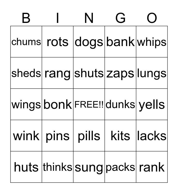 This bingo card has a free space and 24 words: pins, thinks, shuts, huts, whips, chums, sheds, rots, dunks, pills, zaps, wings, kits, lacks, rang, packs, yells, dogs, lungs, bonk, rank, wink, bank and sung.