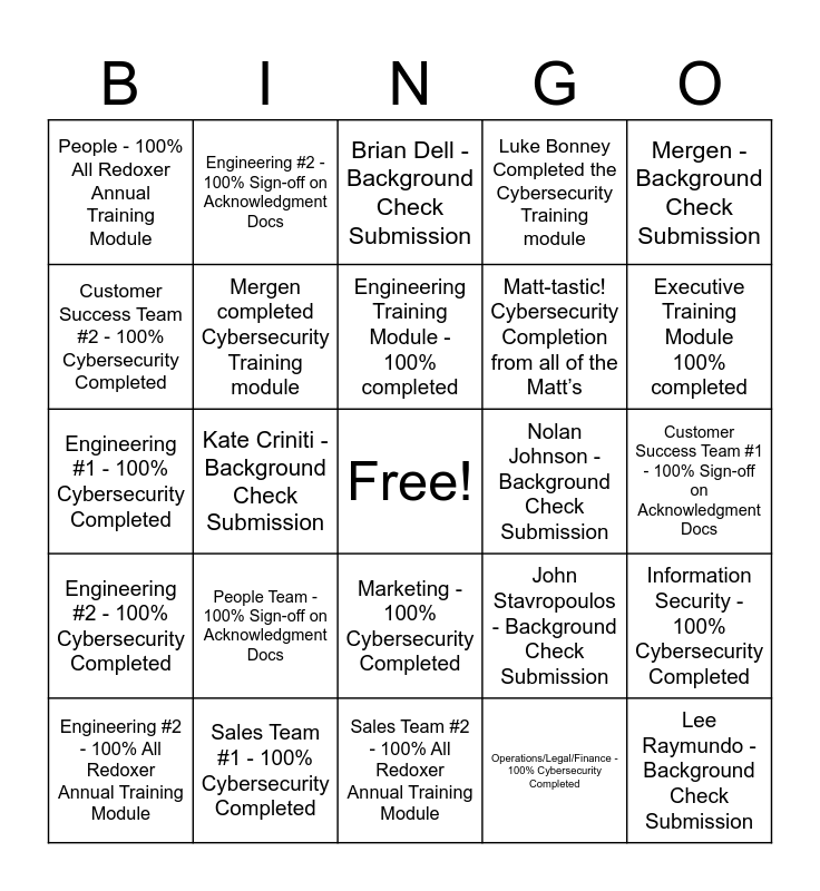 This bingo card has a free space and 57 words: Customer Success Team #1 - 100% All Redoxer Annual Training Module, Engineering #2 - 100% All Redoxer Annual Training Module, Marketing - 100% All Redoxer Annual Training Module, People - 100% All Redoxer Annual Training Module, Sales Team #2 - 100% All Redoxer Annual Training Module, Information Security - 100% All Redoxer Annual Training Module, Mergen completed Cybersecurity Training module, Jessi-tacular! Background Completion from all of the Jessica’s, Matt-tastic! Cybersecurity Completion from all of the Matt’s, Kalyn Gigot Completed Executive Training module, Luke Bonney Completed the Cybersecurity Training module, Melissa Sautter completed Security Training for Customer-Facing Roles module, Crystal 'Claire: Claire Huber and Claire Mauer have completed their All Redoxer Annual Training, Tale of two Clarks: Clark Downum and Clary Foy have signed off on Acknowledgment Docs, Devin Soelberg completed the executive training, Chloe Drew - Background Check Submission, Mergen - Background Check Submission, Kate Criniti - Background Check Submission, Matt Ripkey - Background Check Submission, Lee Raymundo - Background Check Submission, Nolan Johnson - Background Check Submission, Nick-John Weir - Background Check Submission, John Stavropoulos - Background Check Submission, Brian Dell - Background Check Submission, Amy Rich - Background Check Submission, Engineering Training Module - 100% completed, Salesforce Admin Training Module 100% completed, Product Training Module 100% completed, Executive Training Module 100% completed, All People Team Training - 100% completed, Security Training for Customer Facing Roles Module - 100% completed, Security Role-Specific Training Module - 100% completed, Incident Coordinator Training - 100% completed, Customer Success Team #1 - 100% Cybersecurity Completed, Customer Success Team #1 - 100% Sign-off on Acknowledgment Docs, Customer Success Team #2 - 100% Cybersecurity Completed, Customer Success Team #2 - 100% Sign-off on Acknowledgment Docs, Engineering #1 - 100% Cybersecurity Completed, Engineering #1 - 100% Sign-off on Acknowledgment Docs, Engineering #2 - 100% Cybersecurity Completed, Engineering #2 - 100% Sign-off on Acknowledgment Docs, Marketing - 100% Cybersecurity Completed, Marketing - 100% Sign-off on Acknowledgment Docs, Product - 100% Cybersecurity Completed, Product - 100% Sign-off on Acknowledgment Docs, People Team - 100% Cybersecurity Completed, People Team - 100% Sign-off on Acknowledgment Docs, Sales Team #1 - 100% Cybersecurity Completed, Sales Team #1 - 100% Sign-off on Acknowledgment Docs, Sales Team #2 - 100% Cybersecurity Completed, Sales Team #2 - 100% Sign-off on Acknowledgment Docs, Operations/Legal/Finance - 100% Cybersecurity Completed, Operations/Legal/Finance - 100% Sign-off on Acknowledgment Docs, Strategic Partnerships - 100% Cybersecurity Completed, Strategic Partnerships - 100% Sign-off on Acknowledgment Docs, Information Security - 100% Cybersecurity Completed and Information Security - 100% Sign-off on Acknowledgment Docs.