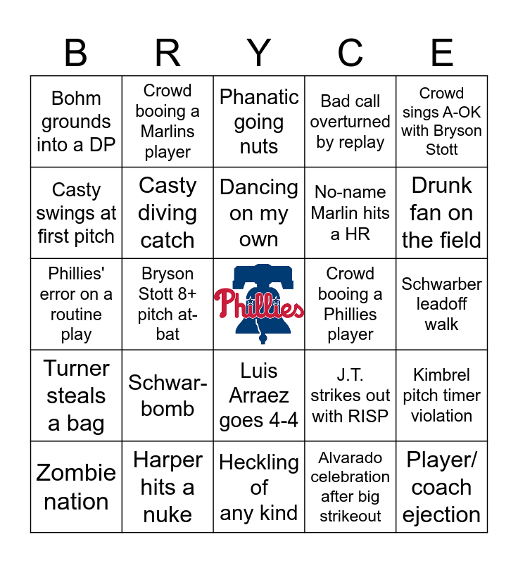 This bingo card has a free space and 24 words: Schwar-bomb, Harper hits a nuke, Dancing on my own, Zombie nation, Crowd sings A-OK with Bryson Stott, Bohm grounds into a DP, Casty swings at first pitch, Crowd booing a Marlins player, Crowd booing a Phillies player, Luis Arraez goes 4-4, No-name Marlin hits a HR, Phillies' error on a routine play, J.T. strikes out with RISP, Kimbrel pitch timer violation, Casty diving catch, Alvarado celebration after big strikeout, Schwarber leadoff walk, Phanatic going nuts, Drunk fan on the field, Bryson Stott 8+ pitch at-bat, Player/ coach ejection, Turner steals a bag, Bad call overturned by replay and Heckling of any kind.
