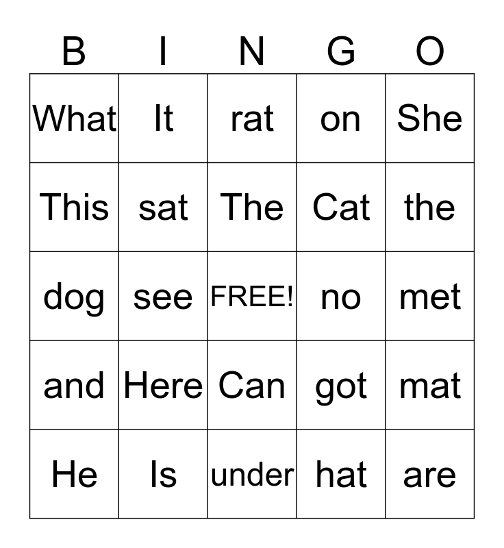 This bingo card has a free space and 24 words: Here, Is, The, He, She, What, This, It, no, Can, Cat, dog, got, mat, sat, hat, met, rat, the, see, are, and, on and under.