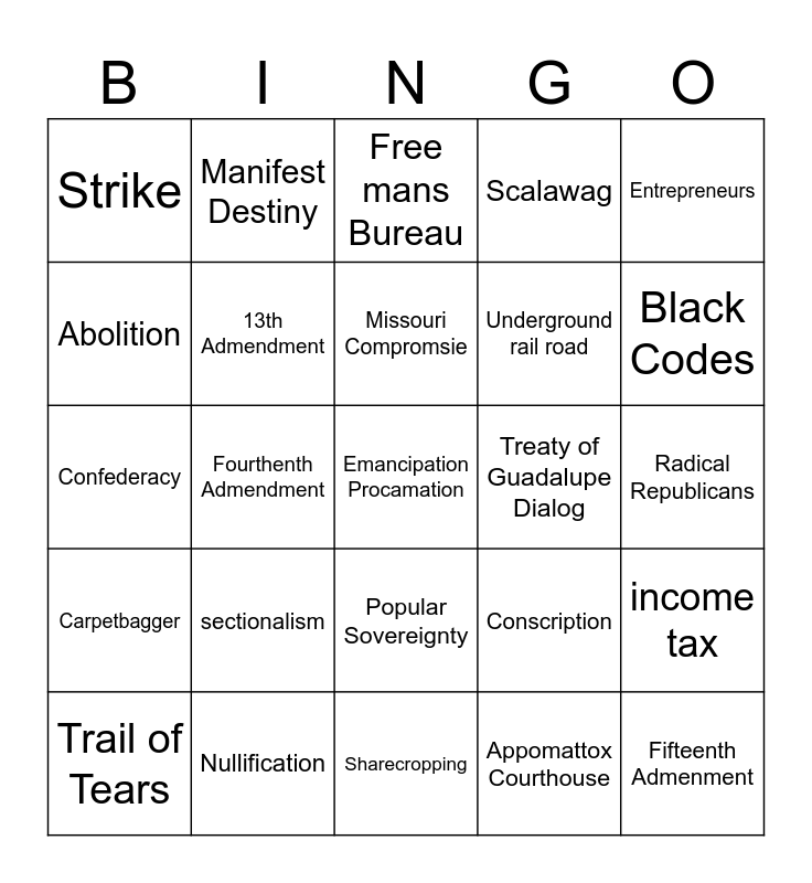 This bingo card has a free space and 24 words: sectionalism, Nullification, Missouri Compromsie, Trail of Tears, Entrepreneurs, Strike, Abolition, Manifest Destiny, Treaty of Guadalupe Dialog, Popular Sovereignty, Underground rail road, Confederacy, Conscription, income tax, 13th Admendment, Appomattox Courthouse, Radical Republicans, Free mans Bureau, Black Codes, Fourthenth Admendment, Fifteenth Admenment, Carpetbagger, Scalawag and Sharecropping.