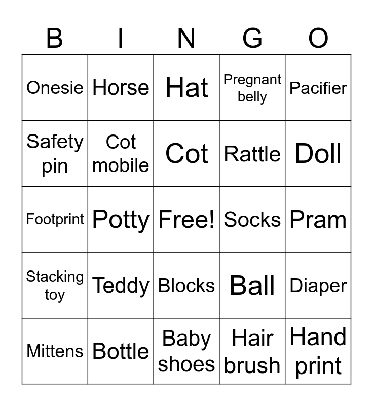 This bingo card has a free space and 24 words: Teddy, Bottle, Cot, Mittens, Pacifier, Onesie, Safety pin, Horse, Socks, Blocks, Rattle, Footprint, Ball, Diaper, Cot mobile, Hair brush, Pram, Hat, Doll, Potty, Hand print, Stacking toy, Pregnant belly and Baby shoes.