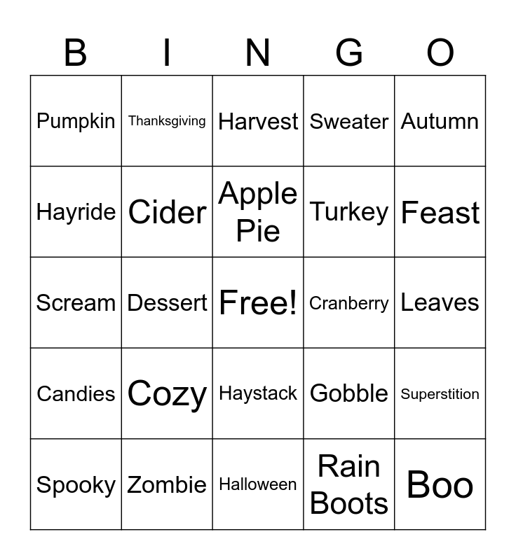 This bingo card has a free space and 24 words: Cozy, Zombie, Apple Pie, Spooky, Autumn, Pumpkin, Hayride, Thanksgiving, Cranberry, Haystack, Turkey, Scream, Gobble, Superstition, Cider, Rain Boots, Leaves, Harvest, Feast, Dessert, Boo, Candies, Sweater and Halloween.