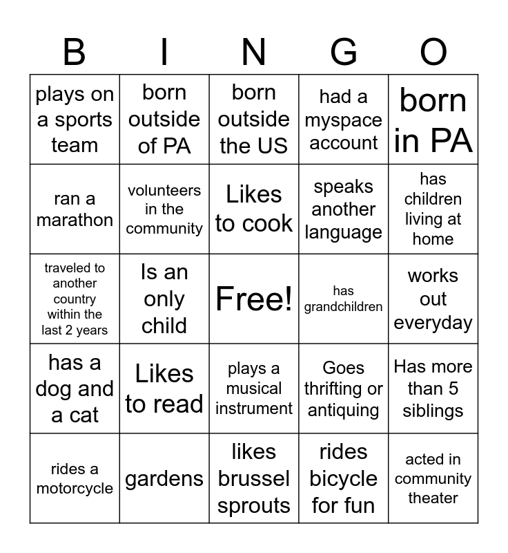 This bingo card has a free space and 24 words: Likes to read, gardens, Likes to cook, rides a motorcycle, born in PA, plays on a sports team, ran a marathon, born outside of PA, has grandchildren, plays a musical instrument, speaks another language, traveled to another country within the last 2 years, Goes thrifting or antiquing, Has more than 5 siblings, volunteers in the community, rides bicycle for fun, works out everyday, born outside the US, has children living at home, Is an only child, acted in community theater, has a dog and a cat, had a myspace account and likes brussel sprouts.