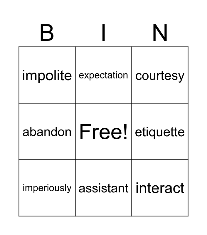 This bingo card has a free space and 8 words: etiquette, courtesy, expectation, imperiously, impolite, interact, abandon and assistant.