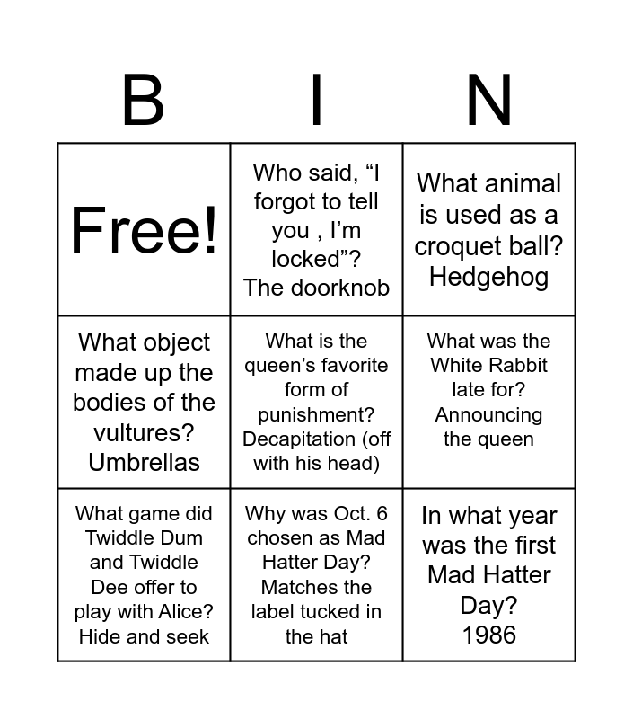 This bingo card has 9 words: What game did Twiddle Dum and Twiddle Dee offer to play with Alice? Hide and seek, What animal is used as a croquet ball? Hedgehog, Who said, “I forgot to tell you , I’m locked”? The doorknob, What object made up the bodies of the vultures? Umbrellas, Free!, What was the White Rabbit late for? Announcing the queen, What is the queen’s favorite form of punishment? Decapitation (off with his head), In what year was the first Mad Hatter Day? 1986 and Why was Oct. 6 chosen as Mad Hatter Day? Matches the label tucked in the hat.