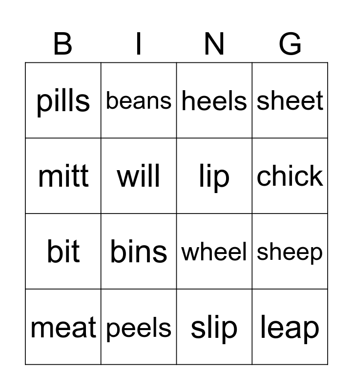 This bingo card has 20 words: sheep, ship, heels, hills, meat, mitt, peels, pills, bit, beans, bins, wheel, will, leap, lip, cheek, chick, sheet, slip and mitt.