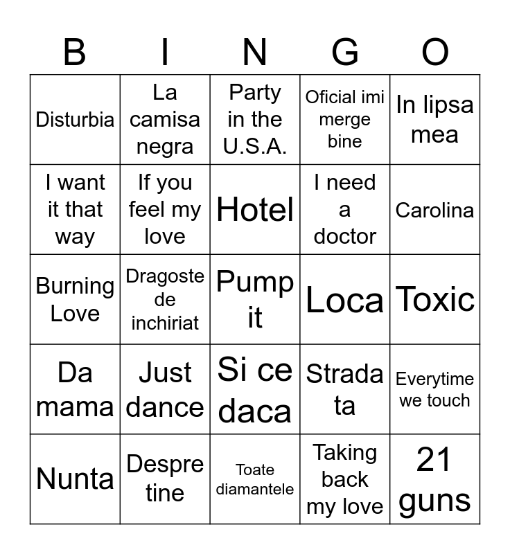This bingo card has 40 words: Never gonna give you up, Burning Love, Coji de portocale, If you feel my love, Despre tine, Si ce daca, Hotel, Din vina ta, In lipsa mea, Da mama, Dragoste de inchiriat, Oficial imi merge bine, Pump it, Toxic, Loca, Just dance, Hot N Cold, Disturbia, E.T., Party in the U.S.A., Everytime we touch, Taking back my love, I need a doctor, I want it that way, So what, Complicated, How you remind me, Butterfly, 21 guns, Wonderwall, Ziua vrajitoarelor, Nunta, Pepita, Strada ta, Carolina, Toate diamantele, Chef de chef, Saint tropez, La camisa negra and Clint eastwood.