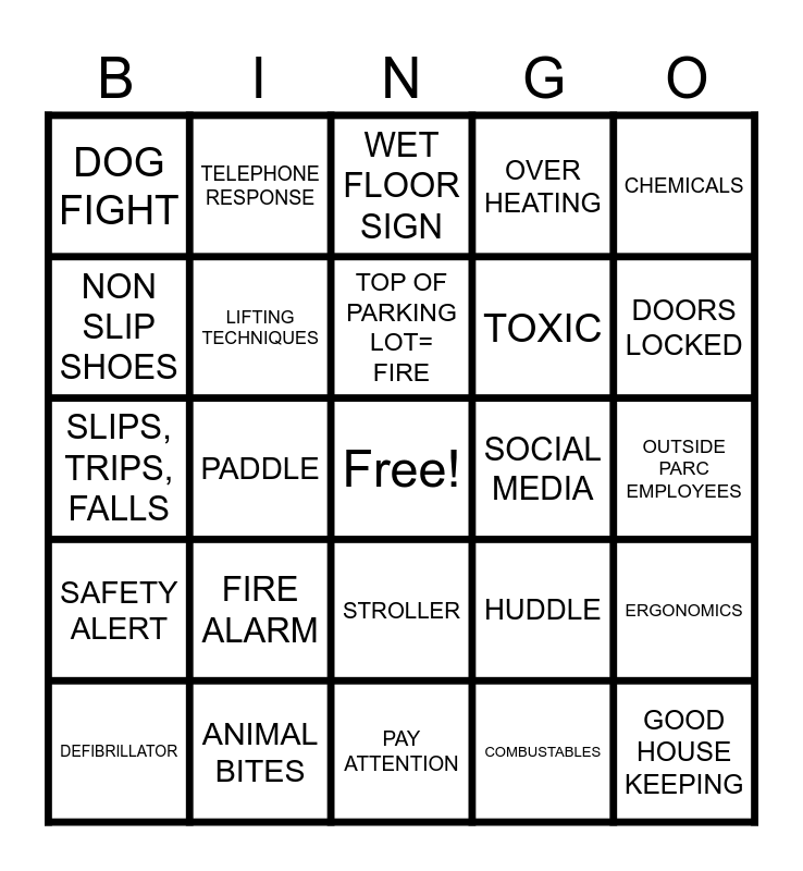 This bingo card has a free space and 74 words: BOOTS, APRON, GLASSES, GLOVES, GRAY GLOVES AND ARM GUARDS, WET FLOOR SIGN, STEEL TOE COVERS, EMERGENCY EYE WASH, 7 MITCHELL ROAD, S.N.A.P., NITRILE GLOVES, DEFIBRILLATOR, EMERGENCY SHOWER, BLACK GLOVES AND ARM GUARDS, LOCKER ROOM= TORNADO, TOP OF PARKING LOT= FIRE, NON SLIP SHOES, AIR HORN, PADDLE, PIG BOARD, DOORS LOCKED, RADIO, SLIPS, TRIPS, FALLS, LIFTING TECHNIQUES, TELEPHONE RESPONSE, OVER HEATING, WEATHER, GOOD HOUSE KEEPING, FIRST AID KIT, LIGHTNING, DEHYDRATION, SPILL KIT, MSDS, CHEMICALS, DUST MASK, MACHINES, ASK FOR HELP, SCRUBS, COMBUSTABLES, EMERGENCY EXITS, RESPONSIBILITY, CORDS, BLOOD PATHOGENS, PAY ATTENTION, ANIMAL BITES, FACE SHIELD, FANCY GLOVES, SCRAPES CUTS SCRATCHES, DOG FIGHT, HAZARD, FIRE ALARM, FIRE EXTINGUISHER, ELECTRIC SAFETY, INJURIES, SHARPS, OUTSIDE PARC EMPLOYEES, CAUTION, NEAR MISS, MANUAL HANDLING, STROLLER, PROPER PPE, POLICY, ERGONOMICS, TOXIC, PROTECTION, SAFETY ALERT, EXPIRATION, SOCIAL MEDIA, VET AND KENNEL, PASSWORD PROTECTION, CYBER CRIMES, HUDDLE, SIT, OFF, NO, YES, LEASH SAFETY, 1:2 RATIO, GATE ENTRY PRECAUTIONS and PLAY YARD RULES.