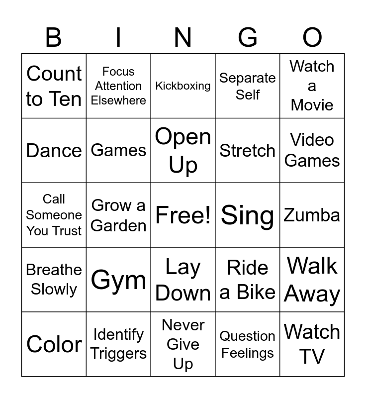 This bingo card has a free space and 92 words: Art, Find a Safe Place, Knitting, Paint, Unwind, Attend Events, Fishing, Kickball, Play Instruments, Utilize Resources, Ask For Help, Fly a Kite, Quiet Time, Video Games, Act Out Feelings, Focus Attention Elsewhere, Kickboxing, Quilting, Volunteer, Address the Issue, Golf, Keep Calm, Quickly Remove Stressors, Visit Family, Breathe Slowly, Games, Listen, Question Feelings, Visit Family, Baking, Gym, Laugh, Read, Watch TV, Count to Ten, Gather Thoughts, Listen to Music, Run, Watch a Movie, Color, Grow a Garden, Lay Down, Ride a Bike, Walk Away, Call Someone You Trust, Get Help, Learn Something New, Relax, Workout, Collect Thougths, Hike, Make a Plan, Rest, Xylophone, Deep Breathing, Hug a Friend, Make Food, Sing, Yoga, Dance, Hang out with a Friend, Meditate, Sleep, Yell in a Pillow, Drink Water, Identify Triggers, Make a Book, Swim, Yoyo, Discuss Feelings, Interact with Friends, Meet New People, Stretch, Zumba, Demonstrate Self-Control, Jog, Nap, Stop and Listen, Zone Out, Eat a Snack, Jump Rope, Never Give Up, Separate Self, Exercise, Journaling, Offer Help to Others, Talk it Out, Escape the Situation, Organize, Take a Walk, Open Up and Observe Surroundings.