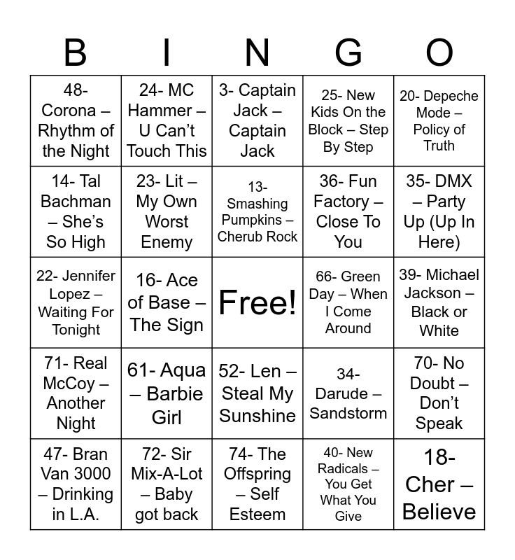 This bingo card has a free space and 75 words: 1- Ace of Base – Don’t Turn Around, 2- Backstreet Boys – Everybody, 3- Captain Jack – Captain Jack, 4- Crazy Town – Butterfly, 5- Depeche Mode – Enjoy the Silence, 6- Fly – Sugar Ray, 7- Haddaway – What Is Love, 8- letters to cleo – I See, 9- Marky Mark And The Funky Bunch – Good Vibrations, 10- Natalie Imbruglia – Torn, 11- Oasis – Wonderwall, 12- Red Hot Chili Peppers – Around the World, 13- Smashing Pumpkins – Cherub Rock, 14- Tal Bachman – She’s So High, 15- Third Eye Blind – Semi-Charmed Life, 16- Ace of Base – The Sign, 17- Bloodhound Gang – The Bad Touch, 18- Cher – Believe, 19- Daft Punk – Around The World, 20- Depeche Mode – Policy of Truth, 21- Foo Fighters – Everlong, 22- Jennifer Lopez – Waiting For Tonight, 23- Lit – My Own Worst Enemy, 24- MC Hammer – U Can’t Touch This, 25- New Kids On the Block – Step By Step, 26- Our Lady Peace – Clumsy, 27- Red Hot Chili Peppers – Californication, 28- Snap! – Rhythm Is a Dancer, 29- The Chemical Brothers – Let Forever Be, 30- TLC – No Scrubs, 31- Alanis Morissette – You Oughta Know, 32- Blur – Song 2, 33- Cornershop – Brimful of Asha, 34- Darude – Sandstorm, 35- DMX – Party Up (Up In Here), 36- Fun Factory – Close To You, 37- Kris Kross – Jump, 38- Los del Rio – Macarena, 39- Michael Jackson – Black or White, 40- New Radicals – You Get What You Give, 41- R.E.M. – Losing My Religion, 42- Robbie Williams – Millennium, 43- Soundgarden – Black Hole Sun, 44- The Cranberries – Dreams, 45- Toni Braxton – He Wasn’t Man Enough, 46- Alice Deejay – Better Off Alone, 47- Bran Van 3000 – Drinking in L.A., 48- Corona – Rhythm of the Night, 49- David Bowie – Im Afraid Of Americans, 50- Duran Duran – Come Undone, 51- Garbage – I Think Im Paranoid, 52- Len – Steal My Sunshine, 53- Madison Avenue – Don’t Call Me Baby, 54- Mr. President – Coco Jambo, 55- Nirvana – Smells Like Teen Spirit, 56- Rammstein – Du hast, 57- Shania Twain – Man! I Feel Like A Woman, 58- Spice Girls – Wannabe, 59- The Offspring – Come Out and Play, 60- Weezer – Buddy Holly, 61- Aqua – Barbie Girl, 62- C+C Music Factory – Gonna Make You Sweat, 63- Counting Crows – Mr. Jones, 64- Deee-Lite – Groove Is In The Heart, 65- Filter – Take a Picture, 66- Green Day – When I Come Around, 67- Lenny Kravitz – Fly Away, 68- Madonna – Vogue, 69- N-Trance – Stayin Alive (feat. Ricardo Da Force), 70- No Doubt – Don’t Speak, 71- Real McCoy – Another Night, 72- Sir Mix-A-Lot – Baby got back, 73- Sublime – What I Got, 74- The Offspring – Self Esteem and 75- Whitney Houston – I’m Every Woman.