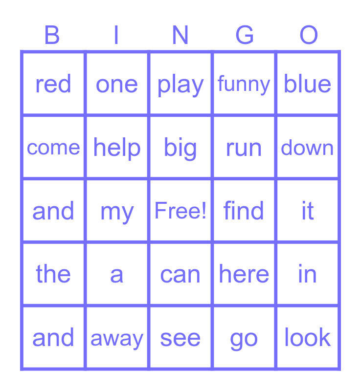 This bingo card has a free space and 24 words: a, away, big, and, blue, red, come, one, find, can, run, and, here, in, help, go, it, play, down, my, look, the, funny and see.