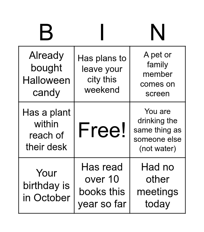 This bingo card has a free space and 8 words: You are drinking the same thing as someone else (not water), A pet or family member comes on screen, Has plans to leave your city this weekend, Your birthday is in October, Already bought Halloween candy, Had no other meetings today, Has a plant within reach of their desk and Has read over 10 books this year so far.