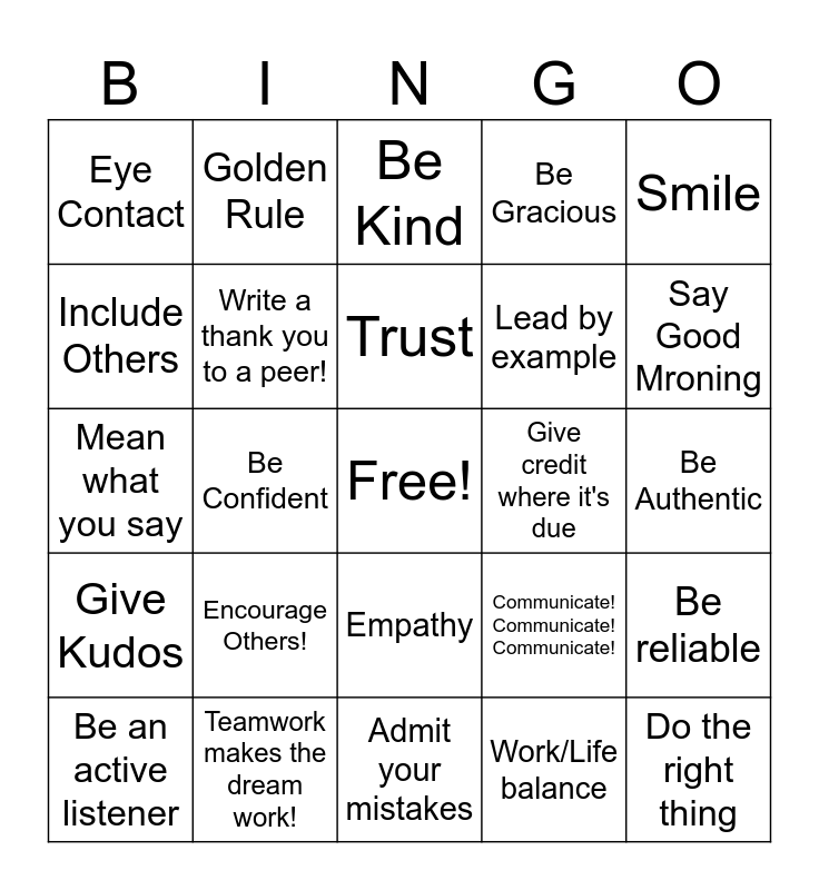 This bingo card has a free space and 24 words: Encourage Others!, Teamwork makes the dream work!, Trust, Be an active listener, Smile, Eye Contact, Include Others, Golden Rule, Give credit where it's due, Empathy, Lead by example, Mean what you say, Communicate! Communicate! Communicate!, Be reliable, Write a thank you to a peer!, Work/Life balance, Be Authentic, Be Kind, Say Good Mroning, Be Confident, Do the right thing, Give Kudos, Be Gracious and Admit your mistakes.