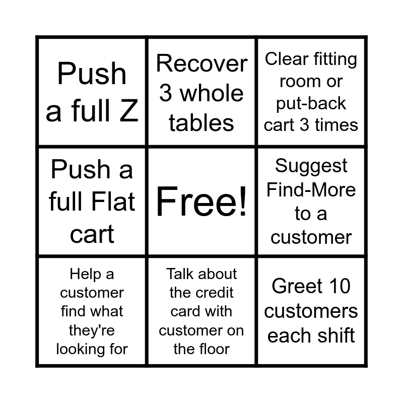 This bingo card has a free space and 8 words: Suggest Find-More to a customer, Clear fitting room or put-back cart 3 times, Recover 3 whole tables, Help a customer find what they're looking for, Push a full Z, Greet 10 customers each shift, Push a full Flat cart and Talk about the credit card with customer on the floor.