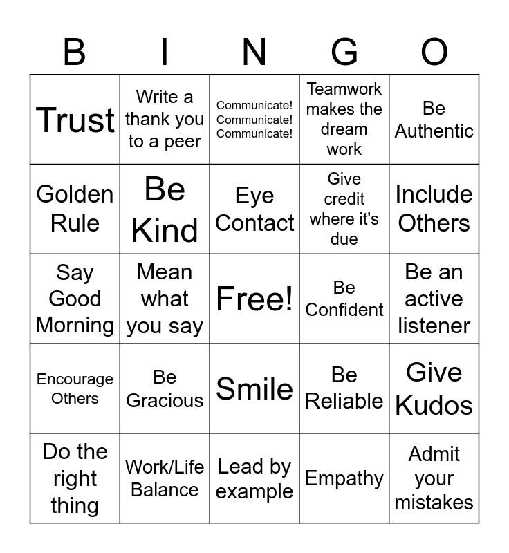 This bingo card has a free space and 24 words: Be Gracious, Work/Life Balance, Eye Contact, Do the right thing, Be Authentic, Trust, Golden Rule, Write a thank you to a peer, Be Confident, Smile, Give credit where it's due, Say Good Morning, Be Reliable, Give Kudos, Be Kind, Empathy, Be an active listener, Communicate! Communicate! Communicate!, Include Others, Mean what you say, Admit your mistakes, Encourage Others, Teamwork makes the dream work and Lead by example.