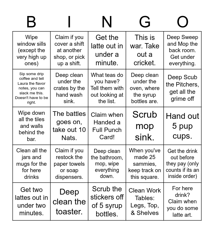 This bingo card has a free space and 44 words: Vacuum and deep clean under the couch., For here drink? Claim when you do some latte art., Deep clean the walk-in., Get two lattes out in under two minutes., Clean Work Tables: Legs, Top, & Shelves, Clean Work Tables: Legs, Top, & Shelves, Get the latte out in under a minute., Dust all lights! Do when customers aren't in the shop., Deep Sweep and Mop the back room. Get under everything., Deep clean the toaster., This is war. Take out a cricket., Scrub mop sink., Deep clean the bathroom, mop, wipe everything down., Claim if you restock the paper towels or soap dispensers., Clean the baseboard tiles around the entire shop., Scrub the stickers off of 5 syrup bottles., Scrub tiles and wall in customer area., Wipe down all the tiles and walls behind the bar., Deep clean where the cubby for the trash by machine., Deep Scub the Pitchers, get all the grime off, Claim if you cover a shift at another shop, or pick up a shift., Wipe down the chairs, Clean the customer trach cubby, Wipe window sills (except the very high up ones), Go one shift without saying slay, you must have a witness initial this., Hand out 5 pup cups., If you show up wearing the same sidecar shirt claim., Claim when you answer the phone, you can do it!, When you've made 25 sammies, keep track on this square., Clean all the jars and mugs for the for here drinks, If a customer tells you "that was fast" or something along that, Get the drink out before they pay (only counts if its an inside order), Guess correctly what playlist is playing when you walk into your shift., If your milk was glorious and wonderful for every drink, claim., The battles goes on, take out 10 Nats., If you pull two shots at the same time and they pull at the same number. Claim., If you wrote a paper/tooks a test/completed a project during this time period, claim this., You got the Sammie out in two to 3 minutes, Nice!, What teas do you have? Tell them with out looking at the list., Sip some drip coffee and tell Laura the flavor notes, you can slack me this. Doesn't have to be right., Deep clean under the oven, where the syrup bottles are., Deep clean under the restock sugars., Deep clean under the crates by the hand wash sink. and Claim if you took your 15 or 30 minute break..