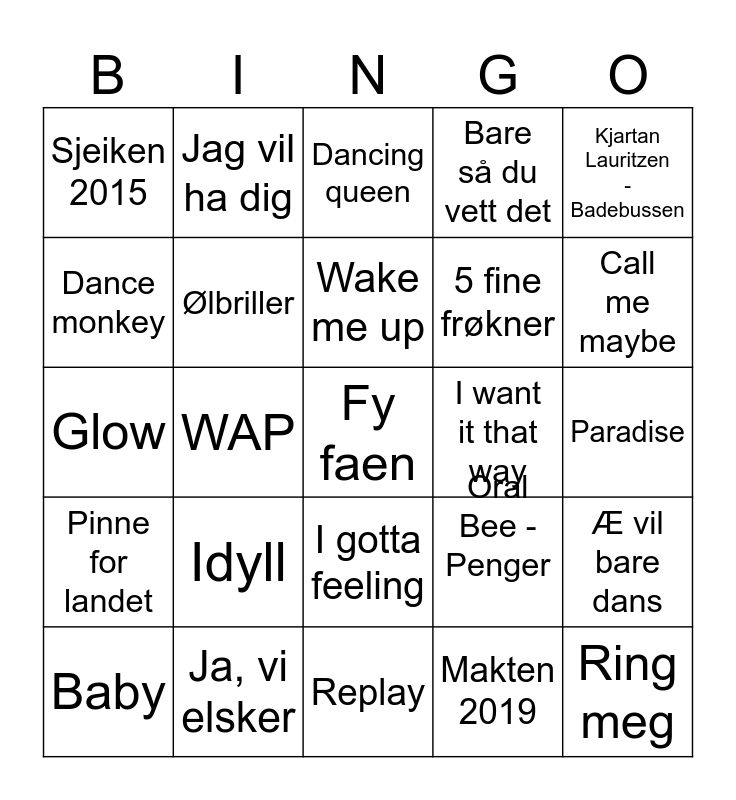 This bingo card has 28 words: Æ vil bare dans, Fredag, 5 fine frøkner, Makten 2019, Dance monkey, Dancing queen, Jag vil ha dig, Pinne for landet, I want it that way, Baby, Glow, Bare så du vett det, Ja, vi elsker, Replay, Call me maybe, Raske briller, Idyll, Ølbriller, Wake me up, I gotta feeling, Sjeiken 2015, Ring meg, Fy faen, WAP, Paradise, Oral Bee - Penger, Kjartan Lauritzen - Badebussen and Eric Craft -.