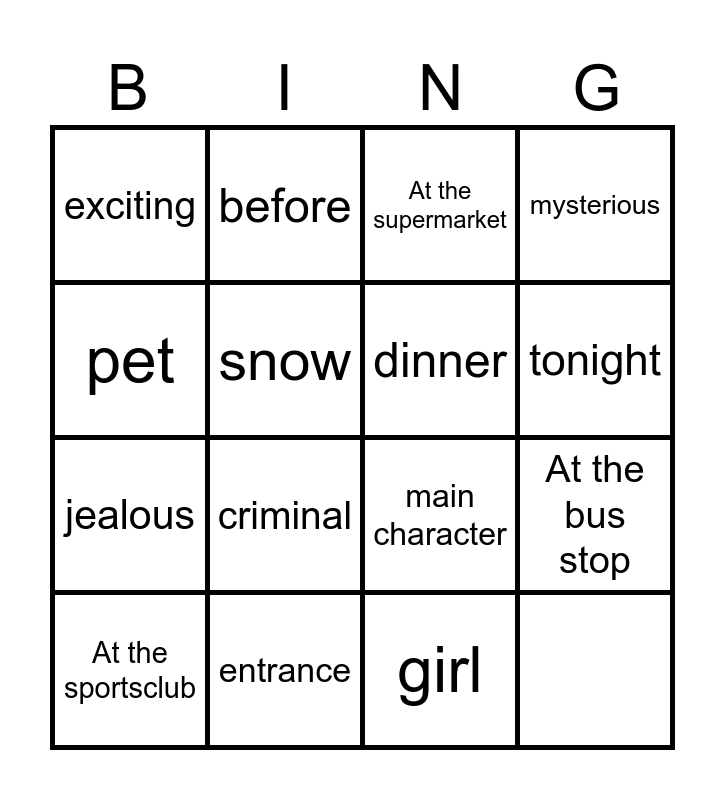 This bingo card has 16 words: Free!, At the sportsclub, before, At the supermarket, tonight, exciting, criminal, main character, mysterious, pet, entrance, dinner, At the bus stop, jealous, snow and girl.
