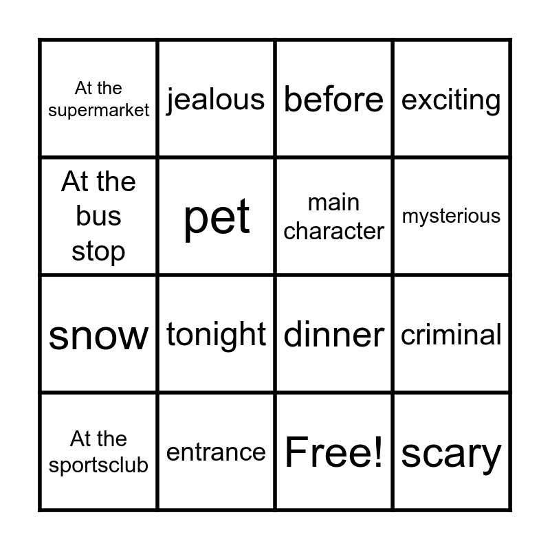 This bingo card has 17 words: Free!, At the sportsclub, before, At the supermarket, tonight, exciting, criminal, main character, mysterious, pet, entrance, dinner, At the bus stop, jealous, snow, girl and scary.