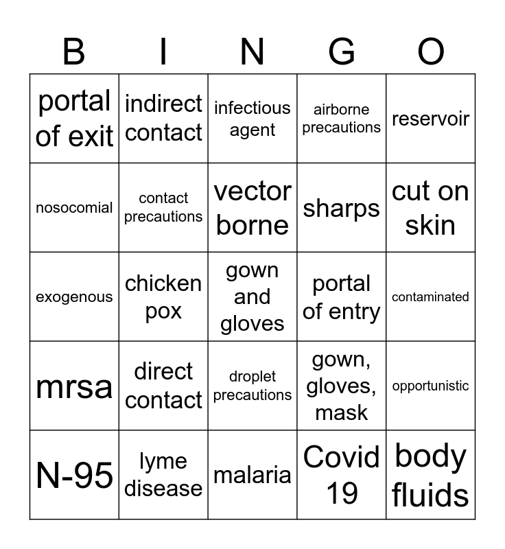 This bingo card has 35 words: communicable disease, Transmission based precautions, Standards Precautions, contact precautions, droplet precautions, airborne precautions, nosocomial, infectious disease, vector borne, vehicle borne, exogenous, reservoir, endogenous, mode of transmission, portal of exit, portal of entry, Covid 19, chicken pox, mrsa, gown and gloves, gown, gloves, mask, N-95, opportunistic, lyme disease, infectious agent, cut on skin, body fluids, vaccine, sharps, contaminated, biohazardous bin, malaria, direct contact, indirect contact and influenza.