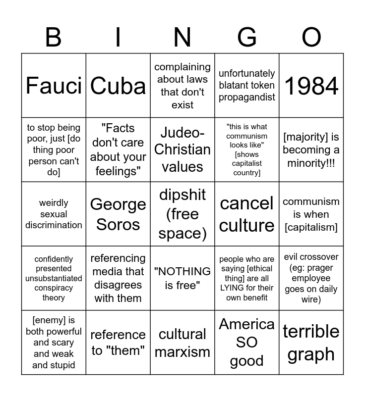 This bingo card has a free space and 30 words: reference to "them", Antifa, George Soros, "WOKE", Fauci, complaining about laws that don't exist, "Facts don't care about your feelings", "NOTHING is free", cancel culture, cultural marxism, communism is when [capitalism], terrible graph, America SO good, insane analogy, [majority] is becoming a minority!!!, whiplash level sudden escalation, people who are saying [ethical thing] are all LYING for their own benefit, confidently presented unsubstantiated conspiracy theory, referencing media that disagrees with them, 1984, weirdly sexual discrimination, CHINA, Cuba, "this is what communism looks like" [shows capitalist country], to stop being poor, just [do thing poor person can't do], unfortunately blatant token propagandist, evil crossover (eg: prager employee goes on daily wire), [enemy] is both powerful and scary and weak and stupid, Judeo-Christian values and shills for [country] but would never live there.