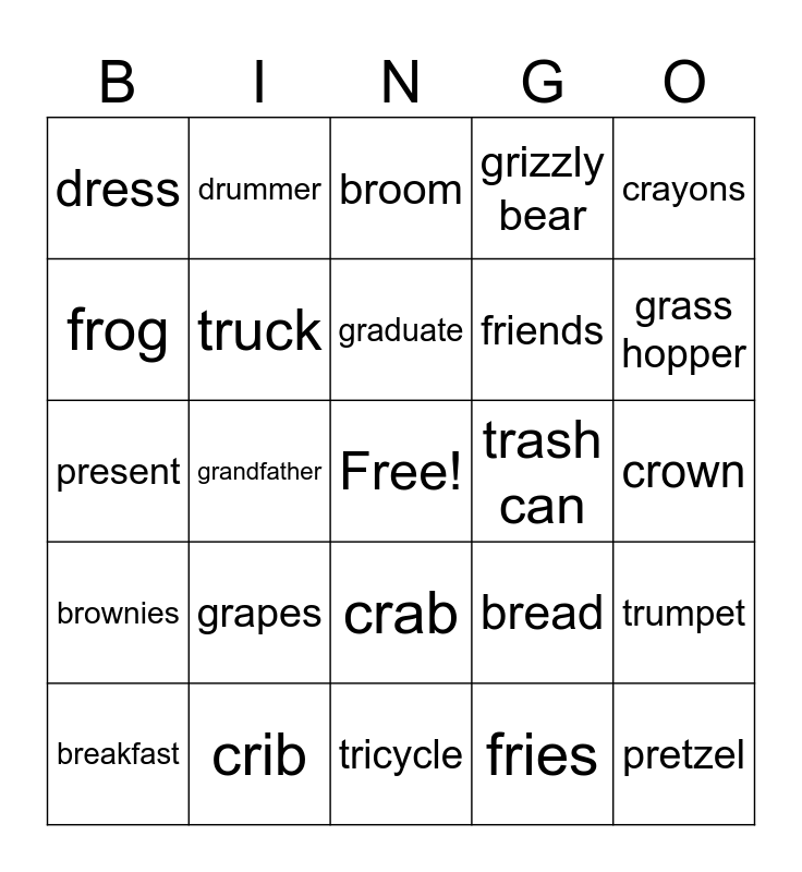 This bingo card has a free space and 24 words: grapes, crib, graduate, breakfast, crayons, dress, frog, drummer, trash can, crab, friends, present, bread, trumpet, truck, fries, crown, broom, grass hopper, grandfather, pretzel, brownies, grizzly bear and tricycle.