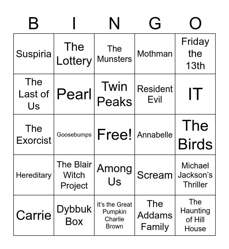 This bingo card has a free space and 45 words: The Shining, The Haunting of Hill House, Coraline, Carrie, The Tell-Tale Heart, The Addams Family, The Munsters, Halloween, Friday the 13th, Dybbuk Box, Mothman, Annabelle, Among Us, The Blair Witch Project, Salem Witch Trials, It’s the Great Pumpkin Charlie Brown, Frankenstein, The Exorcist, Count Chocula and FrankenBerry, IT, The Lottery, Sleepy Hollow, Luigi’s Mansion, Suspiria, Psycho, The Birds, Us, Get Out, Scream, Hereditary, A Nightmare on Elm Street, Michael Jackson’s Thriller, Night of the Living Dead, The Thing, Stranger Things, Goosebumps, Only Murders in the Building, Are you Afraid of the Dark, American Horror Story, Twin Peaks, The Last of Us, Resident Evil, Five Nights at Freddy’s, Pearl and American Psycho.