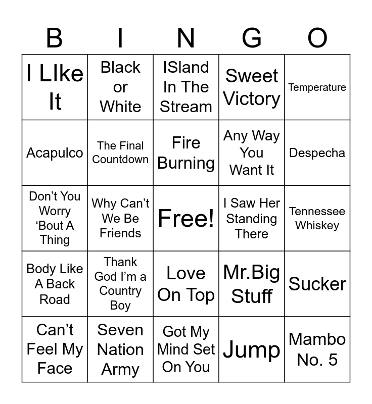 This bingo card has a free space and 61 words: Back In Black, Seven Nation Army, I Love Rock ‘n’ Roll, Body Like A Back Road, Jump, Rock You Like A Hurricane, The Final Countdown, Im Gonna Be ( 500 Miles), Any Way You Want It, I Wanna Rock, Sweet Victory, Calm Down, Acapulco, Uptown Funk, What Makes You Beautiful, I LIke It, Mambo No. 5, Temperature, Moves Like Jagger, Fire Burning, I Saw Her Standing There, ISland In The Stream, Can’t Feel My Face, Sucker, Call Me Maybe, Ice Ice Baby, Help, Just The Way You Are, Despecha, Forget You, Livin La Vida Loca, I will Survive, Blue ( Da Ba Dee), Holding out For A Hero, Black or White, Smooth Criminal, Respect, Why Can’t We Be Friends, Weatherman, Don’t You Worry ‘Bout A Thing, Movin’ Out, Thank God I’m a Country Boy, Tennessee Whiskey, Higher Love, Mr.Big Stuff, Cool, Where Everybody Knows Your Name, Mr. Roboto, Get Ready For This, Love On Top, Got My Mind Set On You, I Got You, You Sexy Thing, ( Let Me Be Your) Teddy Bear, Never CAn Say Goodbye, Dancing Machine, Sir Duke, Dancing With A Stranger, How Do You Sleep ?, This Love and Como La Flor.