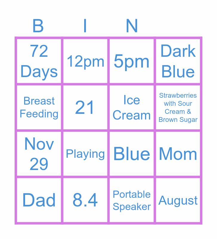 This bingo card has 28 words: Blonde, Dec 1, Nov 29, 9.3, 21, 5pm, 12pm, August, 8.4, Yellow, Blue, Dark Blue, Lemons, 2-3, Playing, Hold/ Snuggle, Deli Meat/ Sub Sanwiches, Ice Cream, Strawberries with Sour Cream & Brown Sugar, Root Canal, 72 Days, Baby Socks, Dad, Mom, Portable Speaker, Phone Charger, Breast Feeding and Constantly Feeding & Changing.