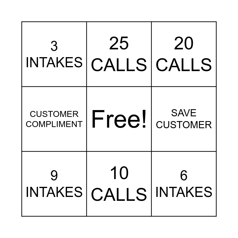 This bingo card has a free space and 10 words: 10 CALLS, 20 CALLS, 3 INTAKES, 6 INTAKES, CUSTOMER COMPLIMENT, 9 INTAKES, 25 CALLS, 15 CALLS, SAVE CUSTOMER and 30 CALLS.
