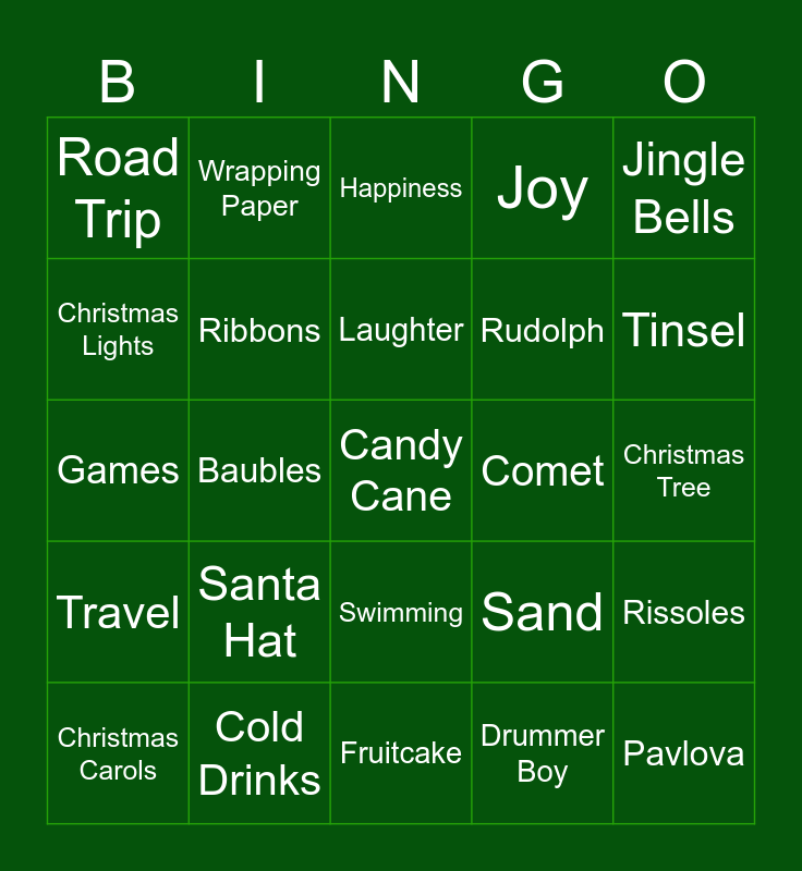 This bingo card has 90 words: Beach Cricket, BBQ, Swimming, Sunscreen, Towels, Family, Gifts, Surprise!, Santa, Prawns, Turkey, Roast Chook, Party, Christmas Tree, Fun!, Laughter, Holiday, Relaxed, Lamingtons, Trifle, Jelly, Pudding, Fruitcake, Bonbon, Games, Cold Drinks, Friends, Beach, Ocean, Sunburn, Snags, Rissoles, Pool, Travel, Road Trip, Joy, Happiness, Flying Overseas, Baubles, Tinsel, Christmas Carols, Christmas Lights, Summer, Heat, Singing, Sand, Six White Boomers, Presents, Christmas Ham, Mrs Claus, Reindeers, Rudolph, Prancer, Dasher, Vixen, Dancer, Comet, Cupid, Donner, Blitzen, Cheese Board, Cocktails, Happy Tears, Elves, North Pole, Nutcracker, Toy Soldier, Drummer Boy, The Grinch, Home Alone, Santa Hat, Candy Cane, Ginger bread, Christmas Cards, Wrapping Paper, Ribbons, Name Tags, Star, Decorations, Wreath, Pavlova, Jingle Bells, Toys, Sleigh, Mistletoe, Custard, Christmas Cake, Ham, Travels and Memories.
