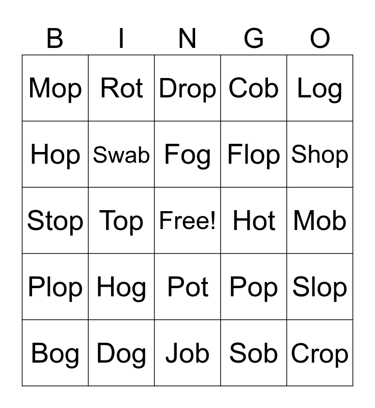 This bingo card has a free space and 24 words: Hog, Dog, Fog, Bog, Log, Mop, Hop, Rot, Hot, Pot, Flop, Stop, Pop, Slop, Swab, Sob, Mob, Drop, Shop, Top, Crop, Plop, Cob and Job.