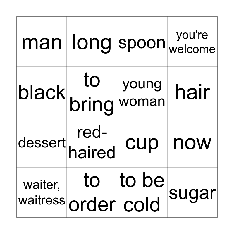 This bingo card has a free space and 15 words: waiter, waitress, sugar, spoon, man, hair, black, red-haired, to be cold, to bring, dessert, now, you're welcome, young woman, long and to order.