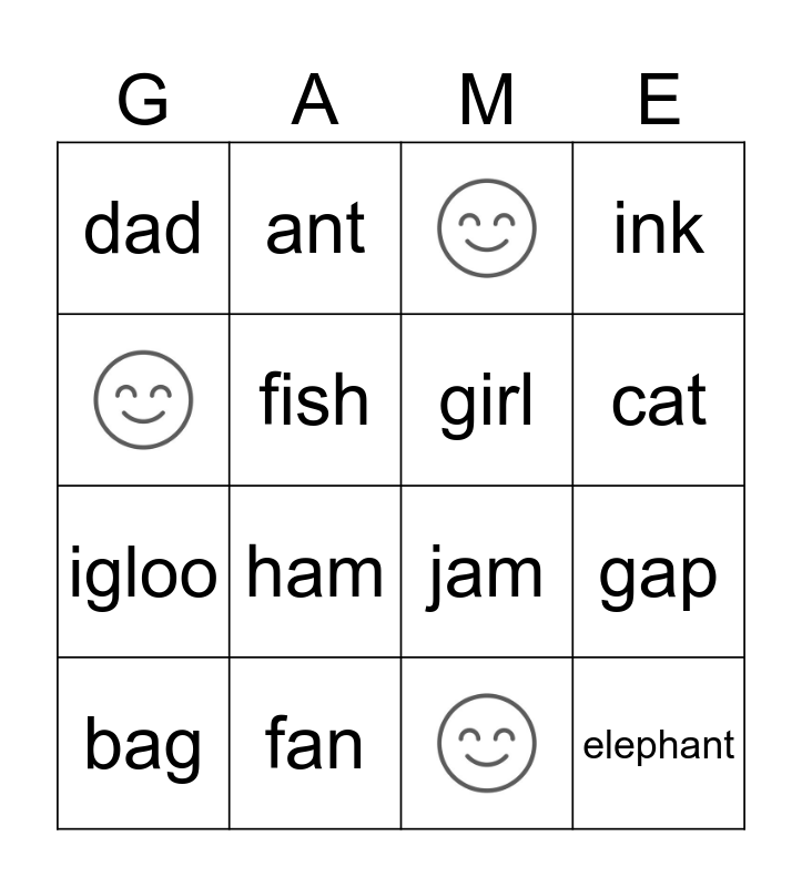 This bingo card has 3 images and 13 words: fan, gap, dad, igloo, ant, jam, fish, bag, ink, ham, cat, girl and elephant.