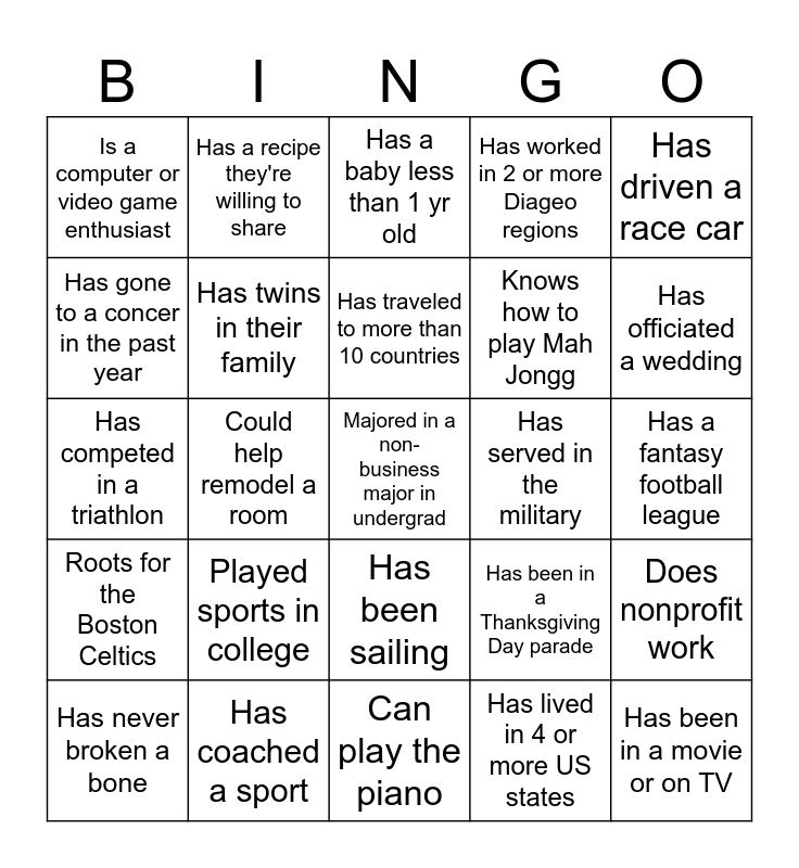 This bingo card has 38 words: Free!, Has met a famous musician, Has been to a major sports event, Has twins in their family, Does nonprofit work, Played sports in college, Has traveled to more than 10 countries, Had a 5+ hour flight to get here!, Has driven a race car, Knows how to play Mah Jongg, Could help remodel a room, Has worked in 2 or more Diageo regions, Majored in a non-business major in undergrad, Has a fantasy football league, Has gone to a concer in the past year, Roots for the Boston Celtics, Has been to Tokyo, Has a baby less than 1 yr old, Works at one of our manufacturing plants, Has served in the military, Is a computer or video game enthusiast, Has coached a sport, Has officiated a wedding, Has never broken a bone, Has dual citizenship, Can play the piano, Has been in a movie or on TV, Has been to Italy, Has been to France, Works in 3WTC, Has been snorkeling, Has been sailing, Has lived in 4 or more US states, Has a recipe they're willing to share, Has lived on a farm, Has been in a Thanksgiving Day parade, Has competed in a triathlon and Was born outside of the US.