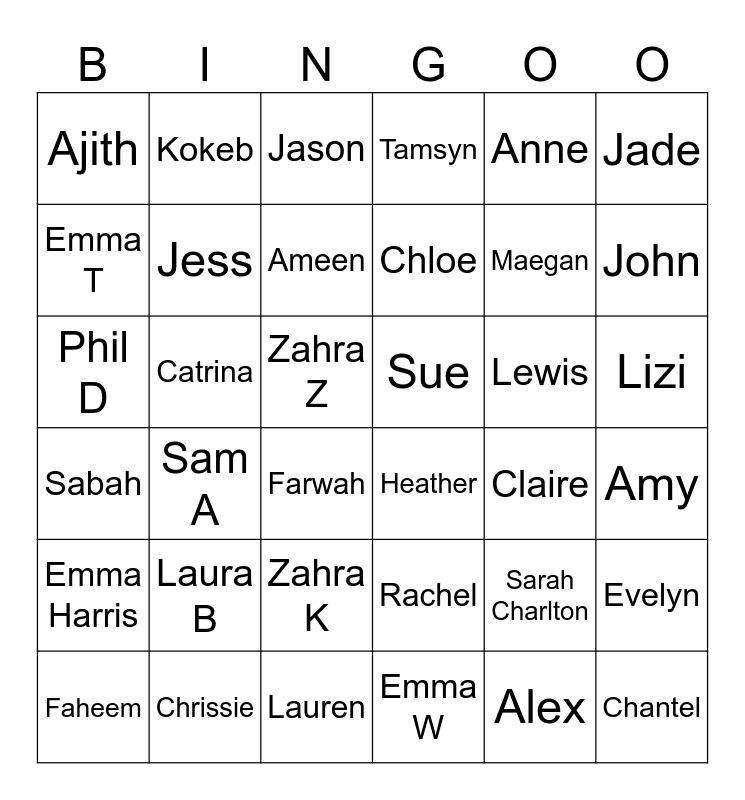 This bingo card has 42 words: Alex, Jess, Sam E, Lewis, Amy, Sam A, Phil D, Zenab, Jason, Lizi, Zahra Z, Chloe, John, Anne, Chrissie, Sabah, Evelyn, Maegan, Chantel, Kokeb, Jade, Zahra K, Emma Harris, Ajith, Aby, Faheem, Ameen, Antony, Laura B, Sarah Charlton, Roger, Sue, Emma T, Claire, Lauren, Farwah, Heather, Catrina, Rachel, Emma W, Tamsyn and Humera.